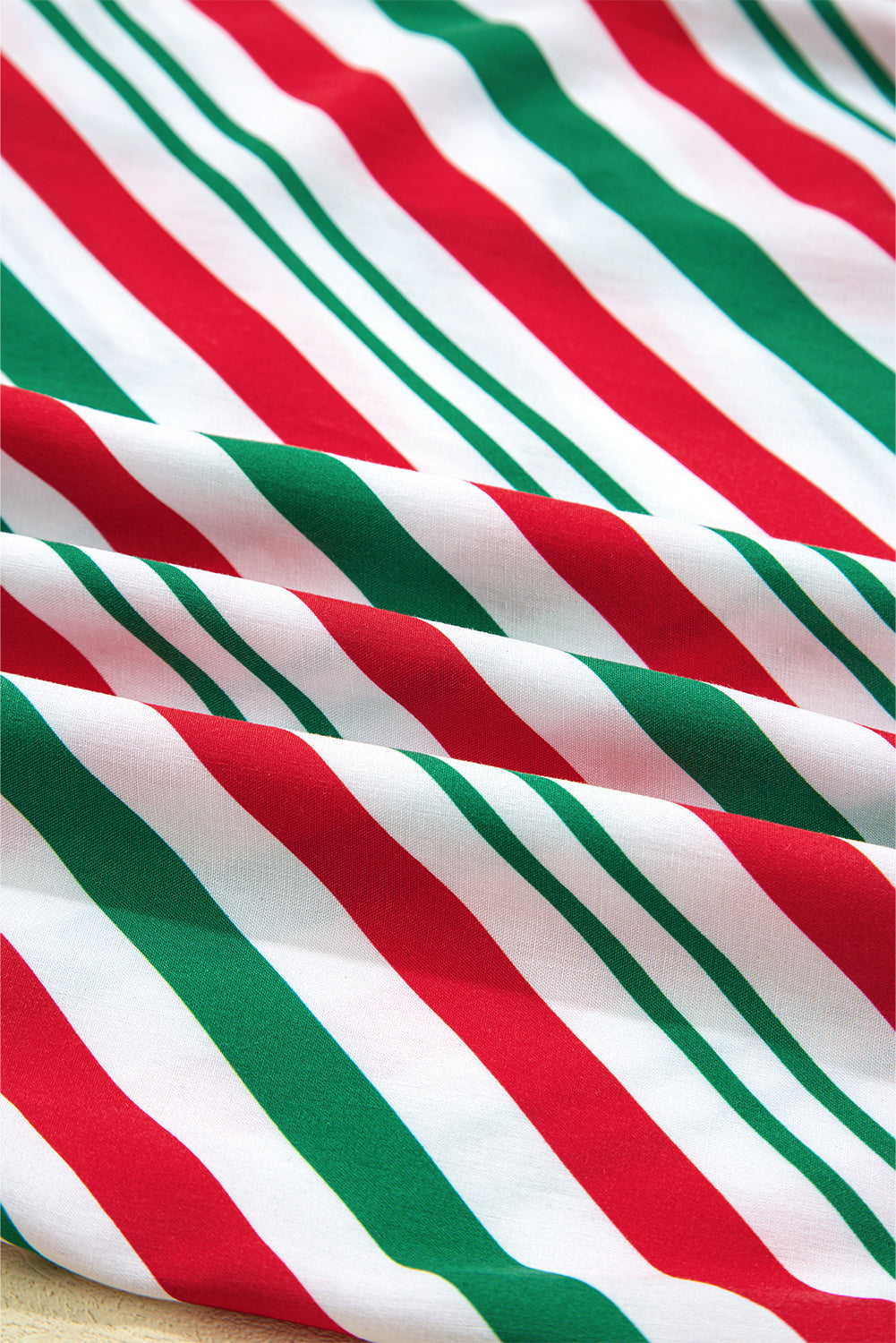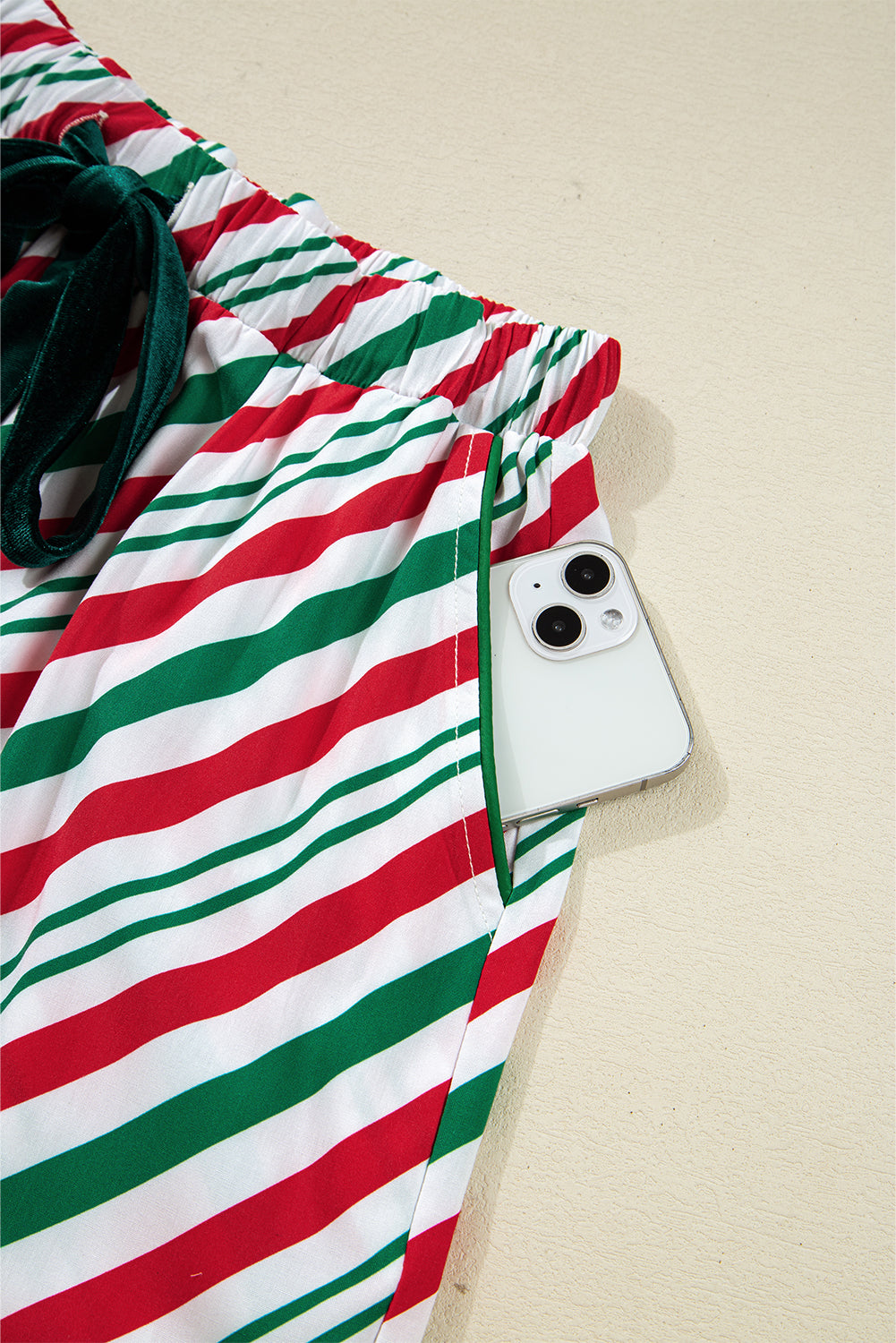 Green Striped Piping Trim Velvet Ribbon Knot Christmas Pajama Set
